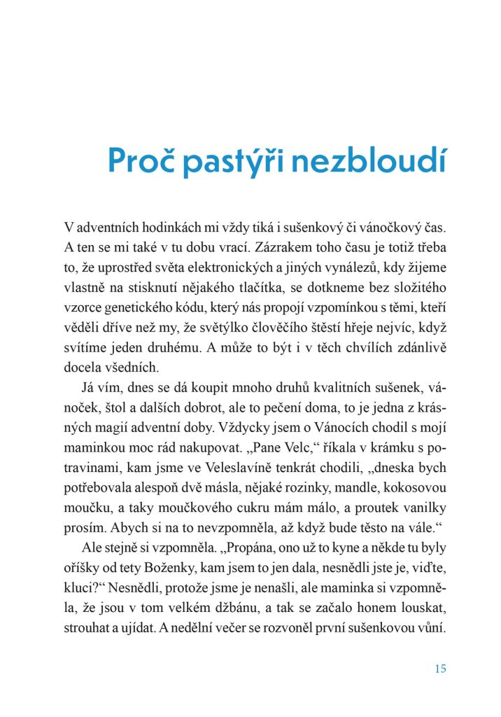 Moc rád jsem chodil s tatínkem dívat se do kostelů na jesličky. Nejraději jsem měl ty jesličky, u kterých anděl nebo černoušek kýval hlavou, když se mu do kasičky vhodila mince. Tatínek mi vždycky nějakou dal a já se zeptal andílka: Bude pod stromečkem hodně dárků? Mince cinkla a andílek kývl, jako že určitě. Někdy jsme zašli i do Štěpánské ulice do řeznictví, které měl strejda Karel, a tatínek nám poručil taliána nevýslovné chuti, jak říkal i František Nepil, a to byla taková pečeť na pergamenu s poselstvím, že jsou už Vánoce. A co slíbili kývající andílkové, obvykle také splnili, i když s dnešními dárkovými orgiemi se to srovnávat nedá. A také jsem žasl, jak se Jezulátko raduje, třebaže je v tom kostele ukrutná zima, protože ze zkušenosti s bulíkem tety Boženky jsem věděl, že tu páru u úst oslík s volkem nezapudí, byť funěli ve chlévě sebevíc. A nezvládli to ani ti, kteří přicházeli a stoupali si vedle venkovských muzikantů, pastýřů, králů a jiné chasy. Jenže Jezulátko stejně to své radování zaselo neviditelně i do srdcí těch, kteří se mu přišli poklonit, a nejen to radování, ale zklidnilo i plavbu korábů lidské mysli po rozbouřeném oceánu obav a nejistot. Neslyšně a neviditelně zavoněla zapomenutá bylinka pokory a naděje.