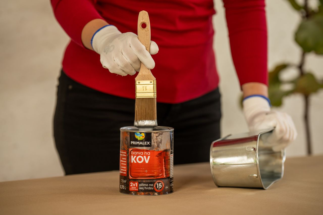 S výhledem na vyzdobené truhlíky bude i to nejchmurnější počasí působit o něco pozitivněji. Začněte novým nátěrem. Kovový truhlík jemně zbruste a následně otřete hadříkem od prachu, mastnoty a dalších nečistot. Povrch musí být také zbaven všech starých a odlupujících se nátěrů. Barvu na kov před použitím i během aplikace důkladně promíchejte, aby na dně nezůstávala usazenina. Nanášejte ji plochým štětcem ve 2–3 vrstvách, mezi kterými nechte odstup asi 24 hodin. Nátěr na podklad krásně přilne a díky výbornému rozlivu zajistí dokonale hladký finální vzhled.