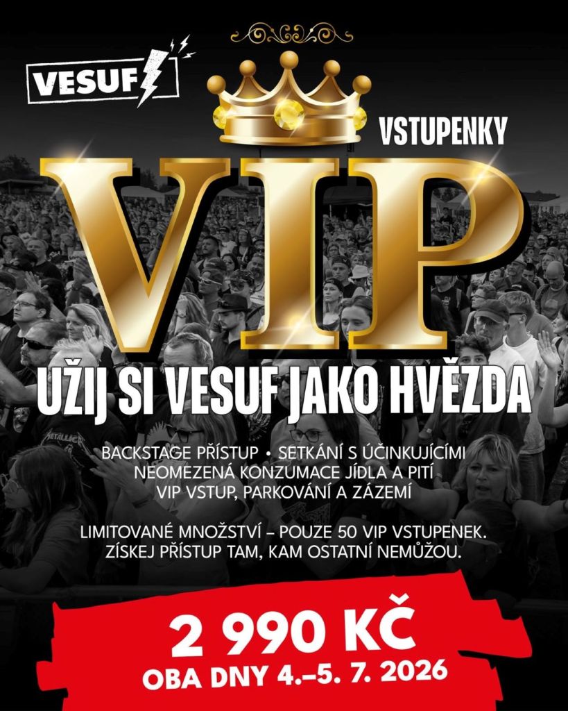 Hledáte dárek, který nabídne nabitý den plný zábavy v přátelské rodinné atmosféře? Darujte vstupenky na multižánrový hudební festival VESUF 2026, který se koná 4.- 5. července 2026! Těšte se na mimořádnou sestavu česko-slovenské kvalitní muziky, kde zazáří již oznámené hvězdy jako Lucie, Kamil Střihavka, Marpo, Martina Pártlová, Walda Gang a spousta dalších. VESUF 2026 se koná v jedinečné přírodní lokalitě na Pastýřské louce u Velenova, jen 40 minut od Brna. Letos poprvé na 2 stagích. Vstupenky jsou k dispozici v klasické variantě pro všechny fanoušky skvělé hudby i v exkluzivní VIP verzi, která nabídne komfort navíc a jedinečný zážitek z festivalu. Festival se pyšní pestrým line-upem, velkým výběrem z cca 25 malých regionálních pivovarů a programem pro celou rodinu.