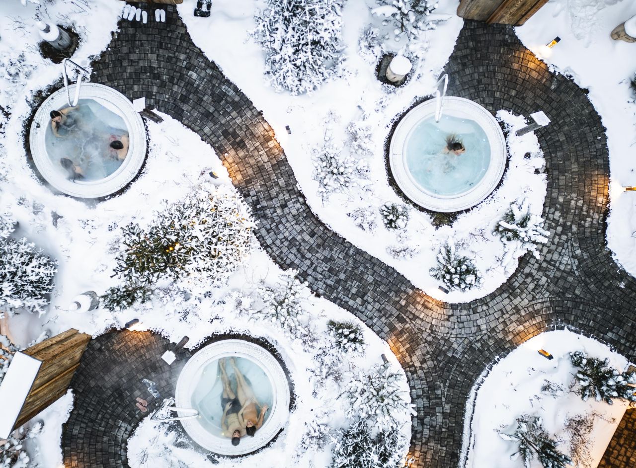K fotogenickým místům v této oblasti ale patří i venkovní wellness zóna, skutečný ráj pro tělo i duši. Obklopená horami, nabízí čtyři vířivky s teplotou vody +35 °C, z nichž se otevírá výhled na vrcholy Crap da la Parè a Mot. V kombinaci s párou stoupající z horké vody vznikají snímky, které působí stejně uvolněně, jak se tam člověk cítí.